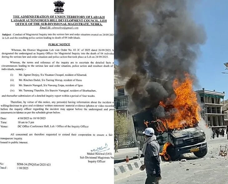 The local magistrate has ordered an inquiry into the Ladakh clashes. An inquiry committee consisting of four members has been formed. It has been directed to identify the causes of the clashes and those responsible and submit a report within 4 weeks. Four people were killed and dozens of civilians were injured in the violence that took place in Leh on 24th of last month. The police have already arrested environmentalist Wanguchuk for being responsible for these incidents.